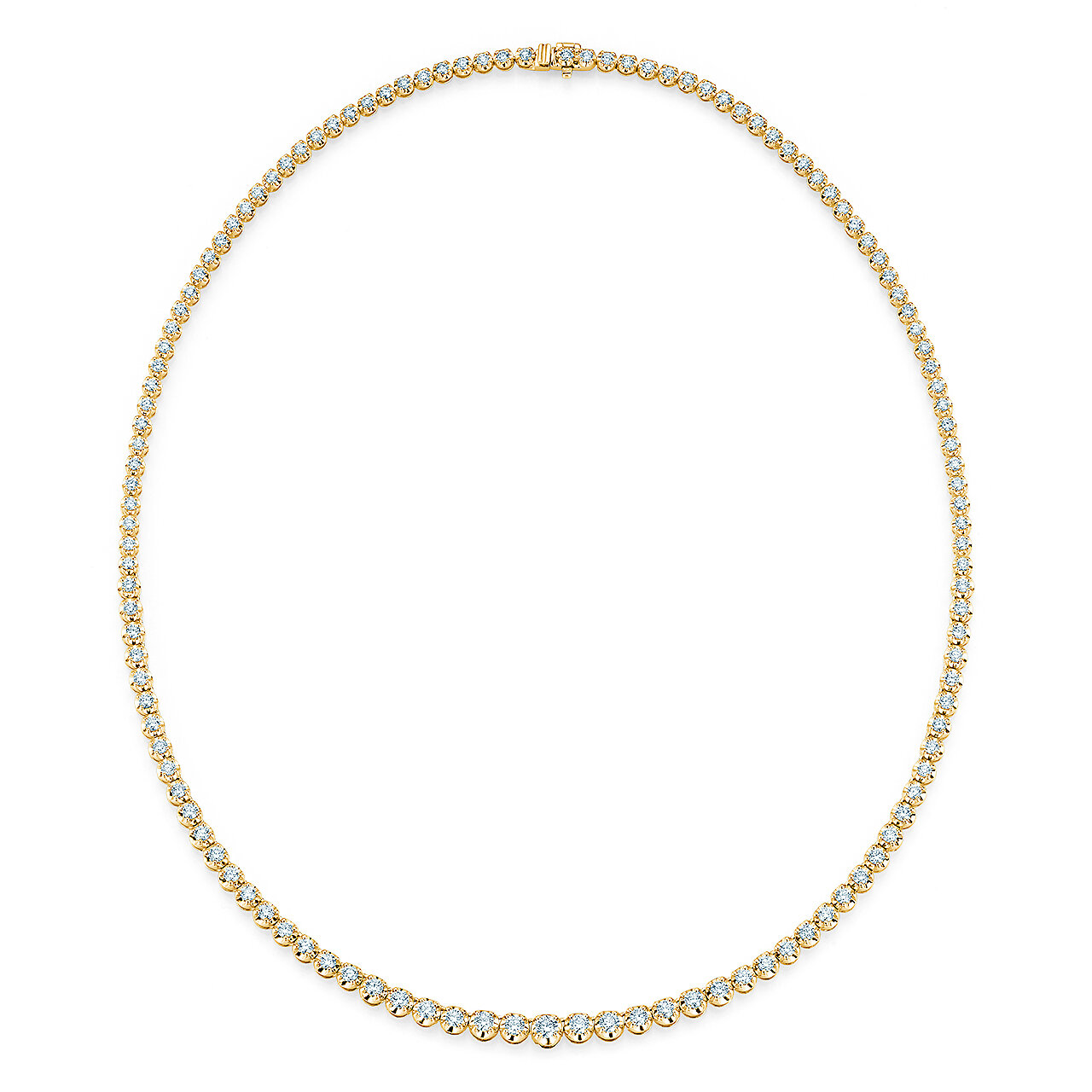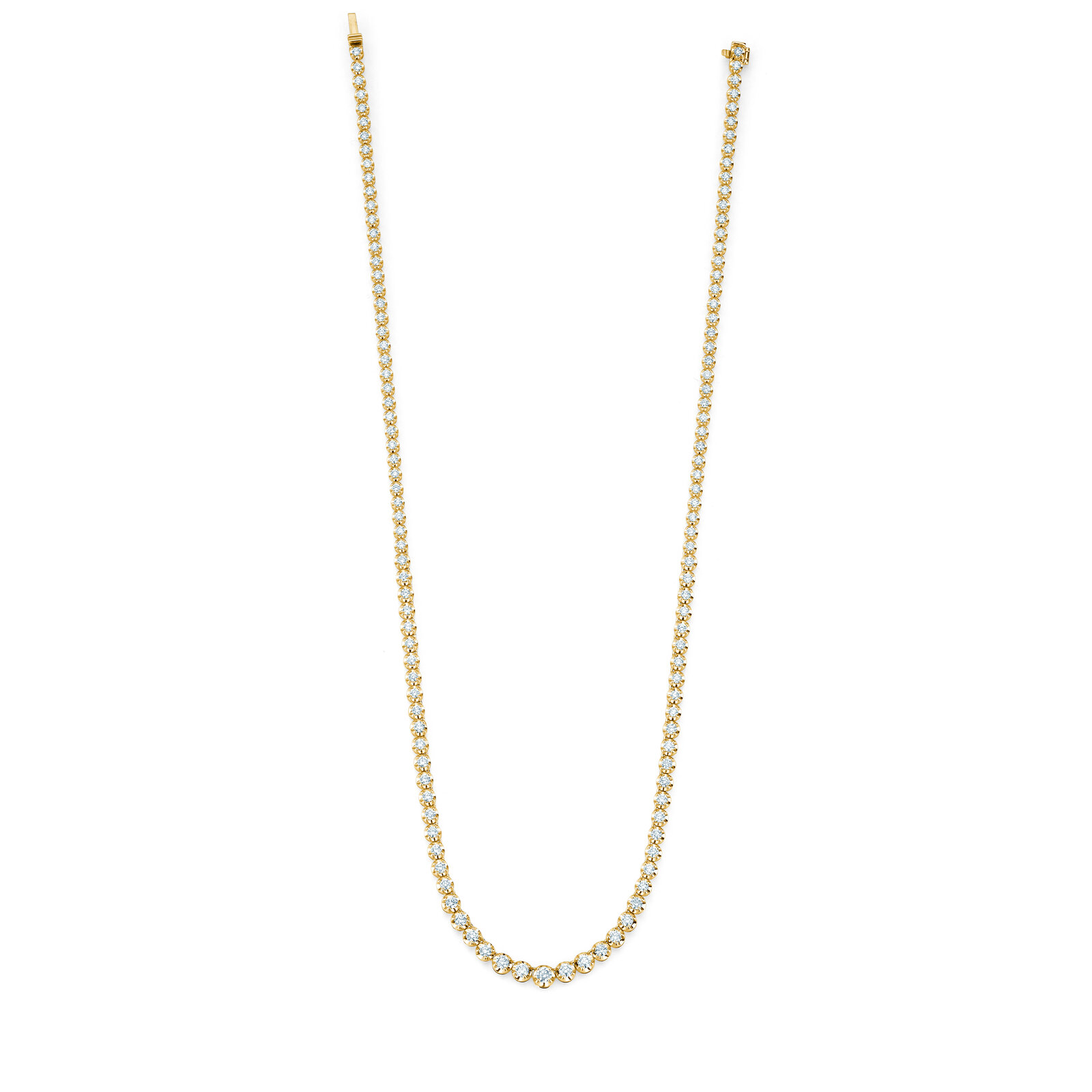 Das klassische Tennis-Collier ist komplett mit Diamanten gefasst, die zur Mitte hin größer werden.