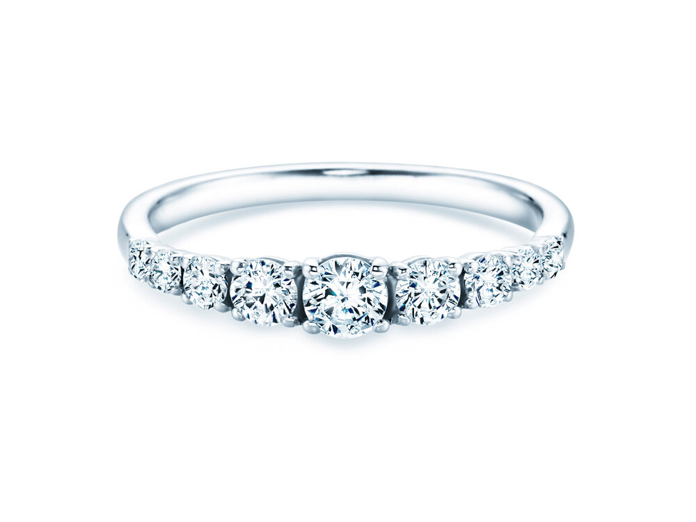 Jetzt entdecken: Das ausgewogen und elegante Modell 9 Diamonds ist mit neun funkelnden Diamanten unterschiedlicher Größe besetzt, die zur oberen Mitte der Ringschiene hin stetig größer werden.