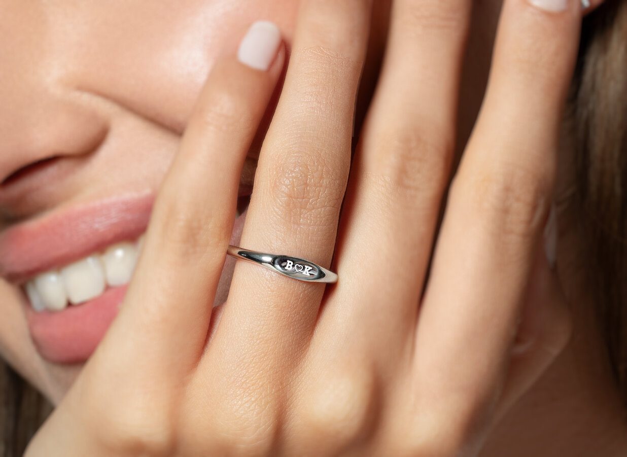 Der Ring Signet bietet eine schlichte, elegante Form und die Option für eine persönliche Gravur. Mit Platz für bis zu fünf Zeichen ist dieser Ring ideal für Initialen oder gravierte Symbole. Ein Geschenk voller Bedeutung – ideal zum Teilen gemeinsamer Erinnerungen.