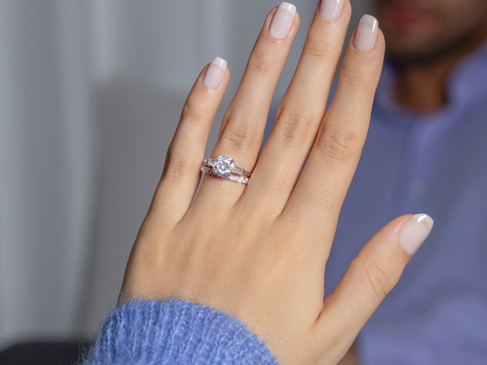 Ungewöhnlich elegant: mit einer Doppelkrappe wird der Mittelstein beim Modell Brillant Tapered Baguette gefasst.