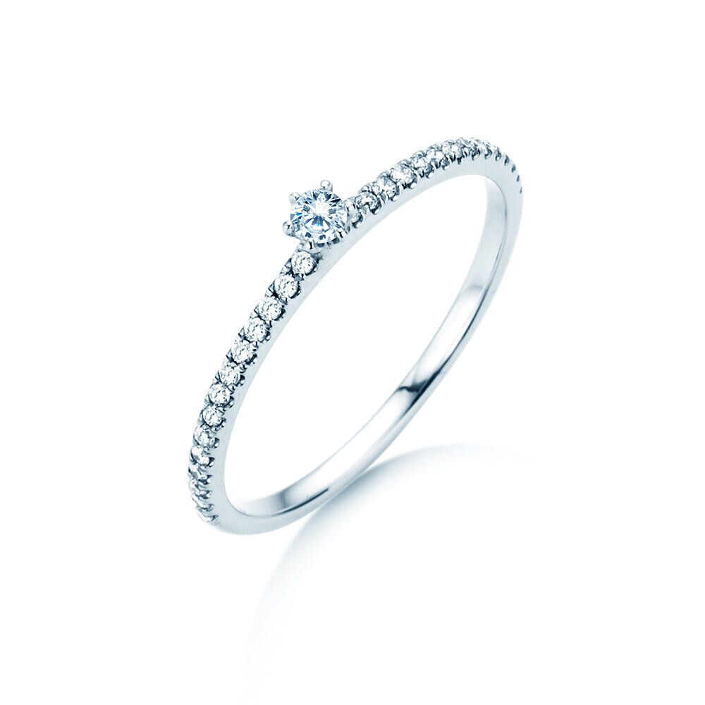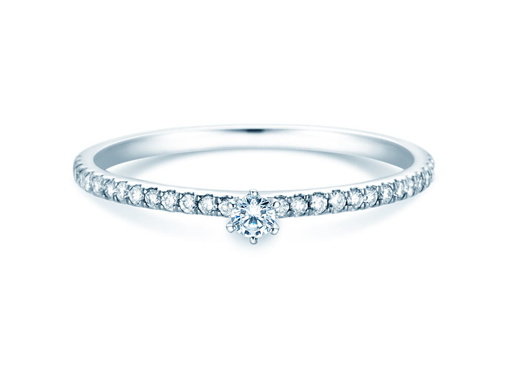 Verlobungsring Classic Pavé mit echten Diamanten: Hauptstein mit Krappenfassung und Seitensteine als Pavé. Die diamantenbesetzte Fassung entlang der Ringschiene, Pavé genannt, verleiht dem Diamantring Classic Pavé seinen edlen Look.
