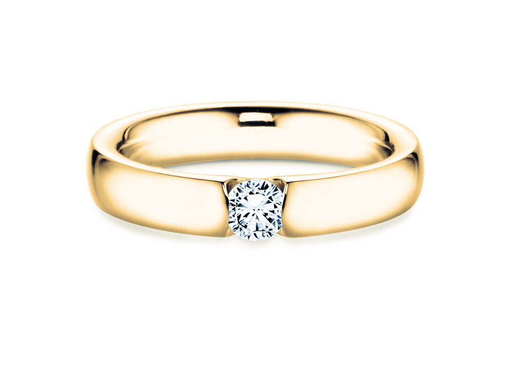 Die ausgewogene und klare Linienführung der Ringschiene schafft Raum für eine außergewöhnliche, offen gestaltete Fassung. Dieser moderne Fassungstyp vereint zwei entscheidende Vorteile in sich: Zum einen wird der intensiv leuchtende Diamant sicher umschlossen, zum anderen fällt durch die großzügig geöffneten Seiten reichlich Licht, sodass der Stein seine besondere Leuchtkraft entfalten kann.