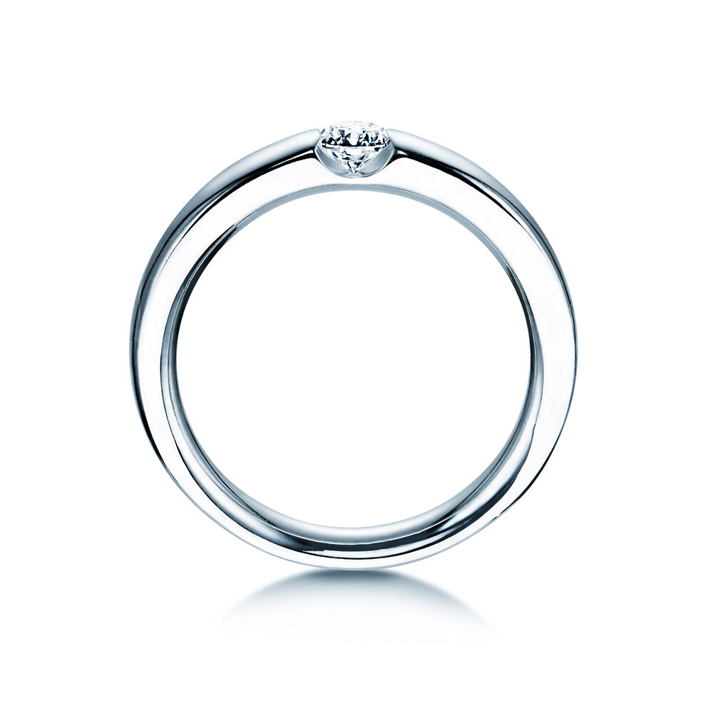 Die ausgewogene und klare Linienführung der Ringschiene schafft Raum für eine außergewöhnliche, offen gestaltete Fassung. Dieser moderne Fassungstyp vereint zwei entscheidende Vorteile in sich: Zum einen wird der intensiv leuchtende Diamant sicher umschlossen, zum anderen fällt durch die großzügig geöffneten Seiten reichlich Licht, sodass der Stein seine besondere Leuchtkraft entfalten kann.