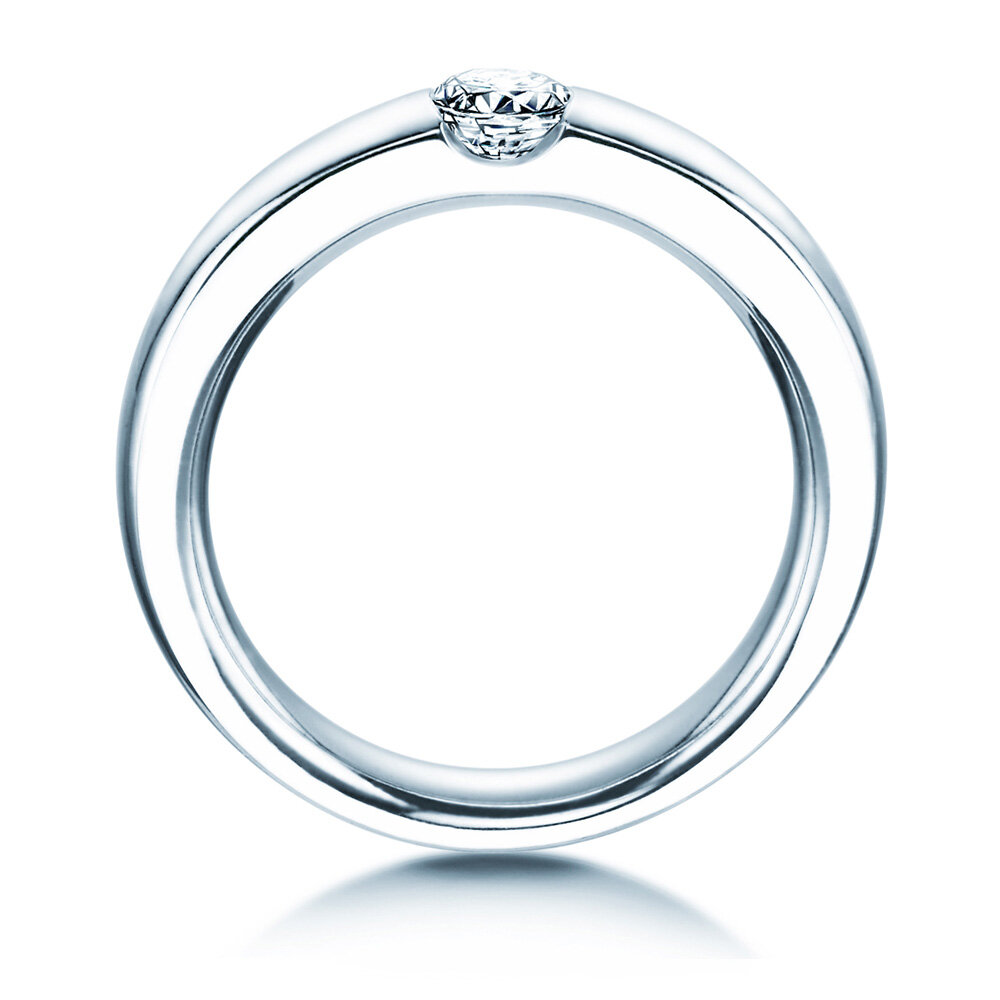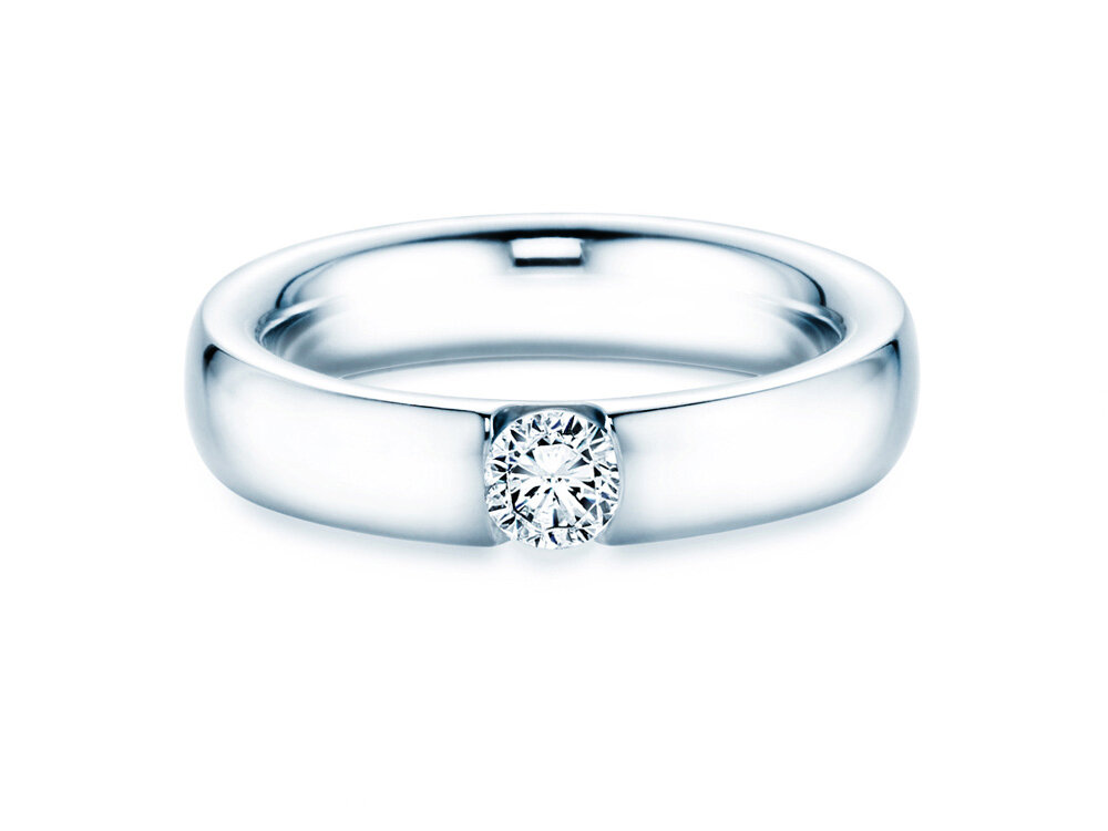 Die ausgewogene und klare Linienführung der Ringschiene schafft Raum für eine außergewöhnliche, offen gestaltete Fassung. Dieser moderne Fassungstyp vereint zwei entscheidende Vorteile in sich: Zum einen wird der intensiv leuchtende Diamant sicher umschlossen, zum anderen fällt durch die großzügig geöffneten Seiten reichlich Licht, sodass der Stein seine besondere Leuchtkraft entfalten kann.