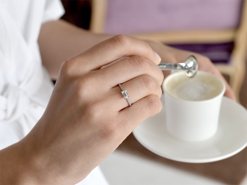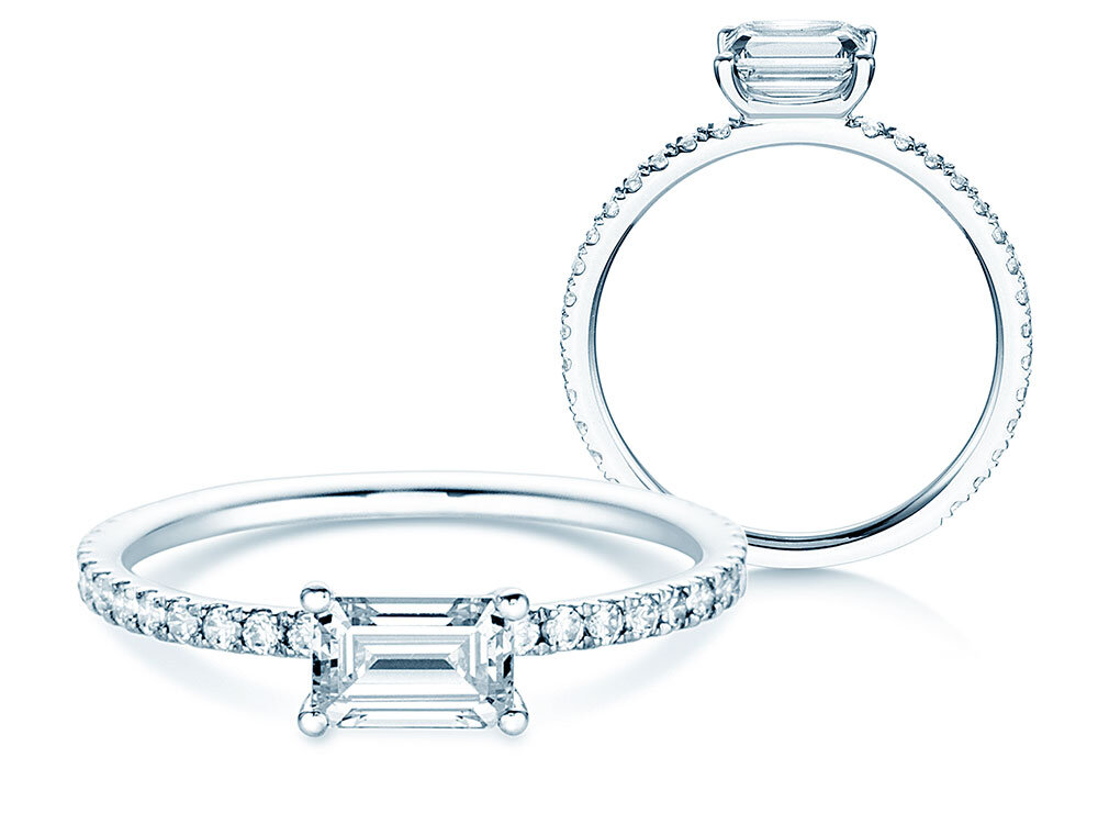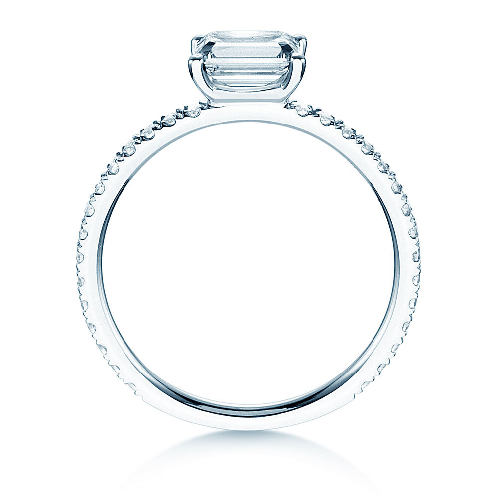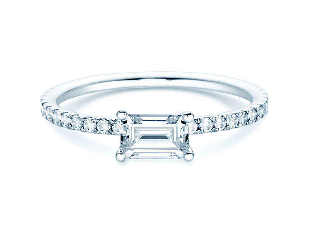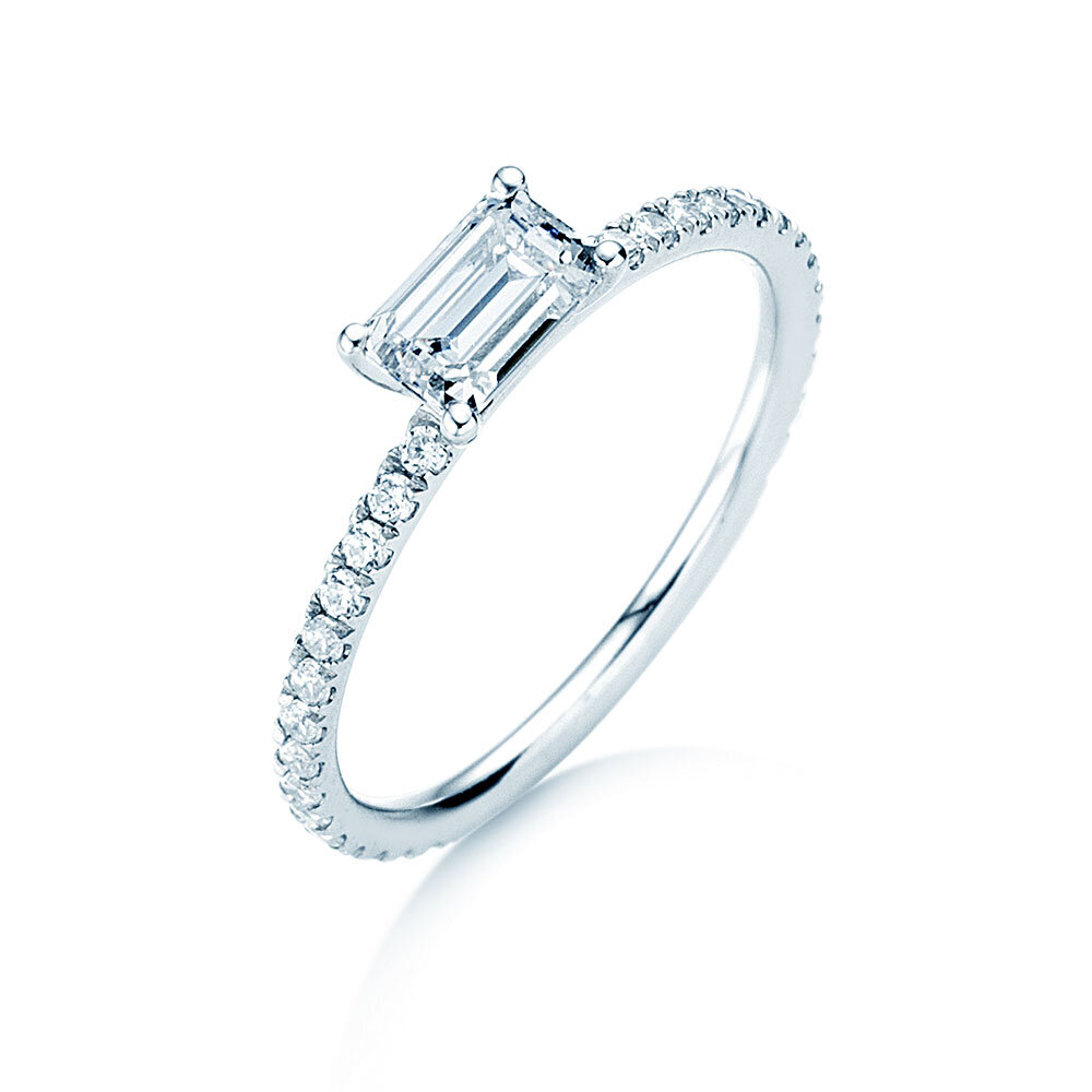 Fein und filigran verarbeitet präsentiert sich der Verlobungsring Emerald Cut. Wählbar in vier Diamantgrößen ab 0,20 Karat. Im präzise geschmiedeten Kanal der Ringschiene sind Pavé-Diamanten mit zusammen 0,24 ct. gefasst.
