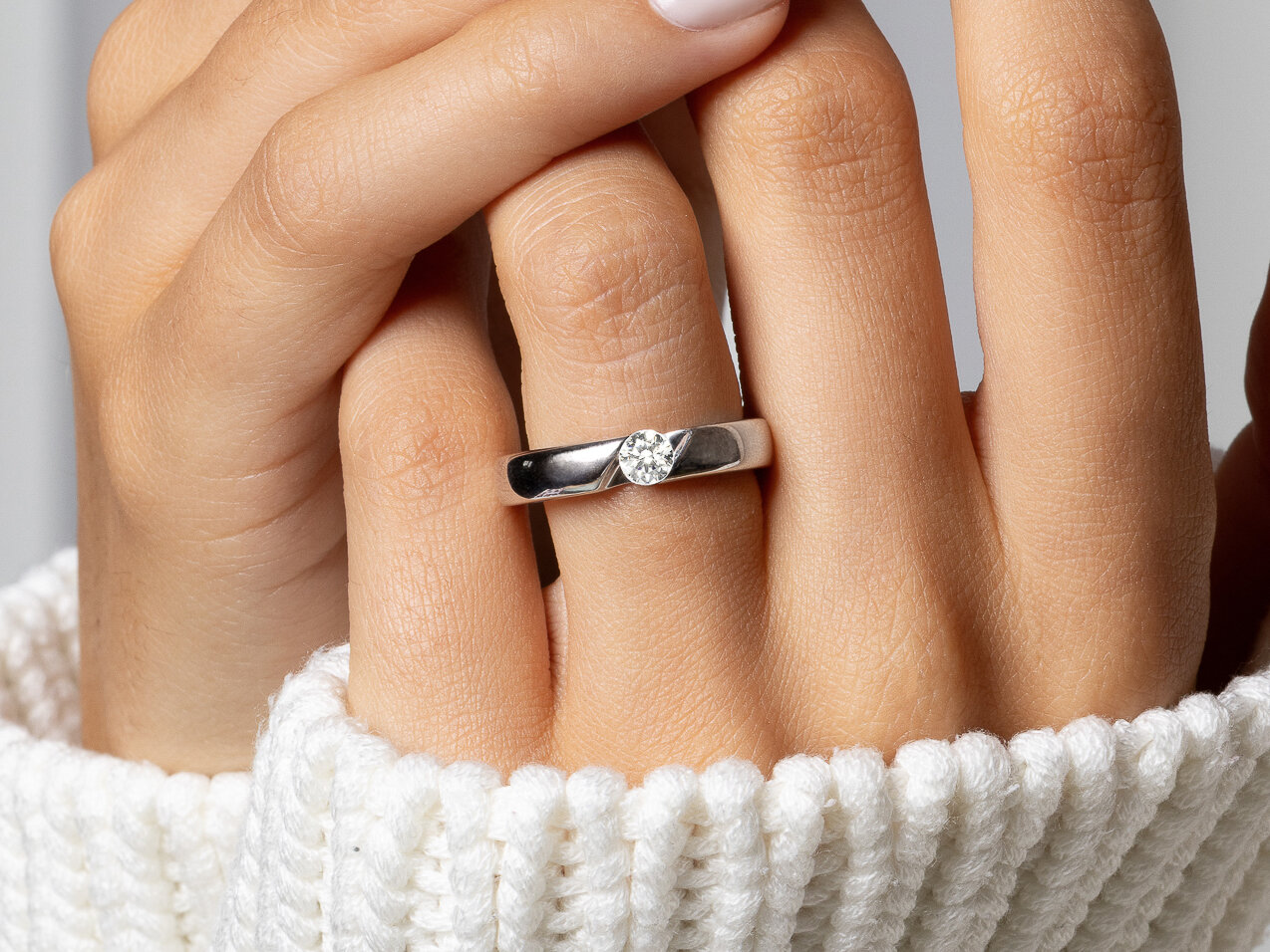 Ein klassischer Spannring, schlicht und elegant. Auf den zweiten Blick offenbart sich seine besondere Raffinesse, die diagonal verlaufende Fassung. Sie gibt dem Diamanten sicheren Halt und sorgt, durch die offen ausgeformten Seiten, für seitlich einfallendes Licht. Der Diamanten beginnt zu strahlen.