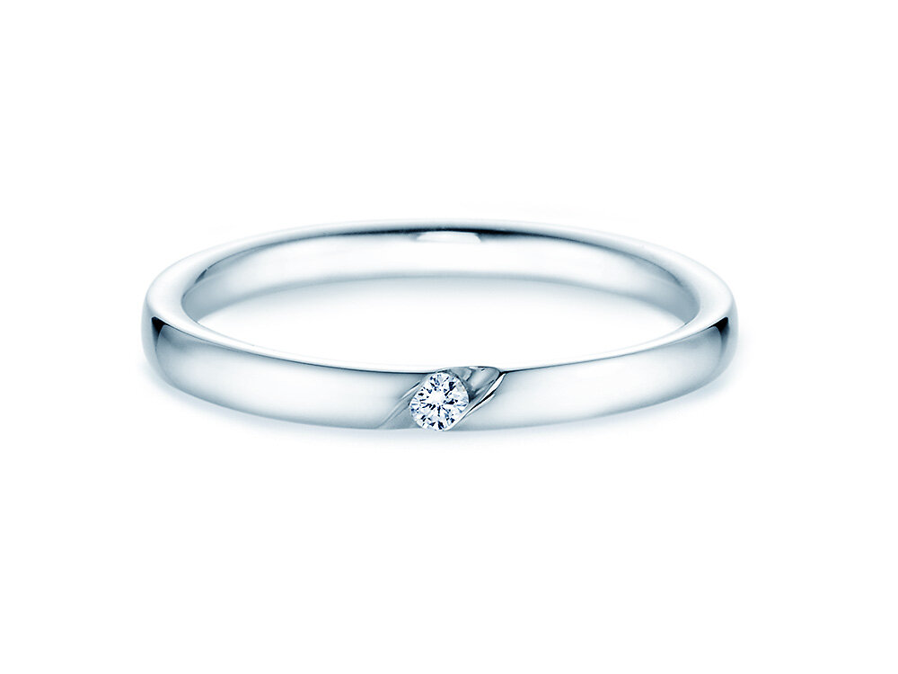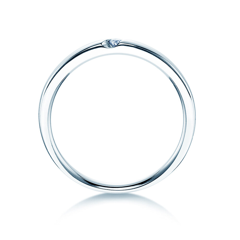 Ein klassischer Spannring, schlicht und elegant. Auf den zweiten Blick offenbart sich seine besondere Raffinesse, die diagonal verlaufende Fassung. Sie gibt dem Diamanten sicheren Halt und sorgt, durch die offen ausgeformten Seiten, für seitlich einfallendes Licht. Der Diamanten beginnt zu strahlen.