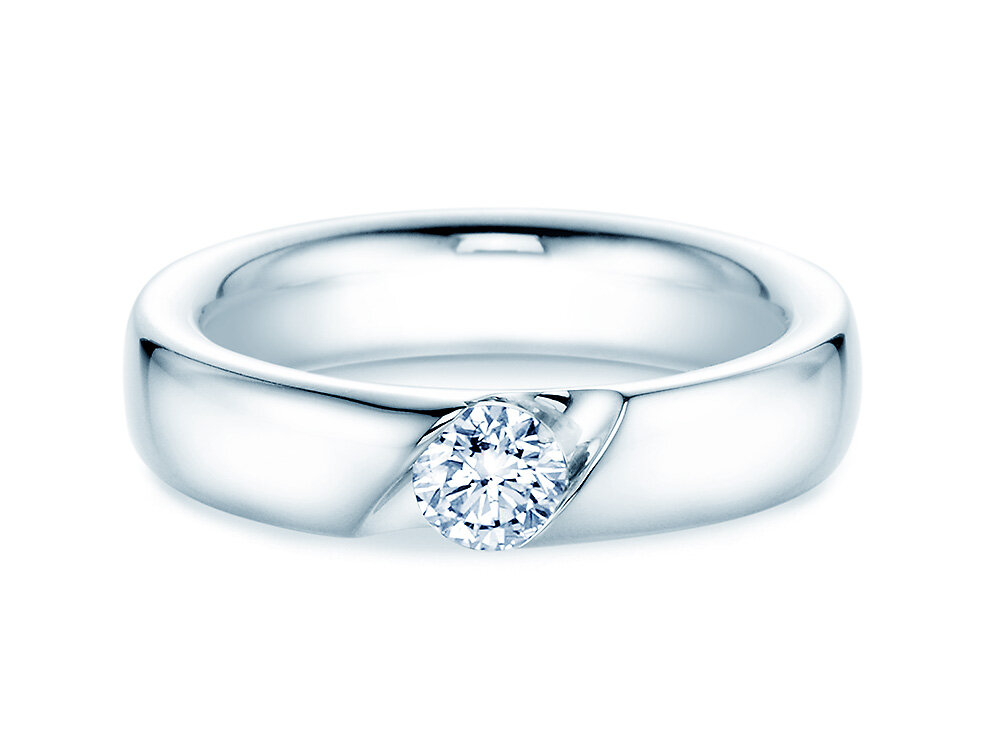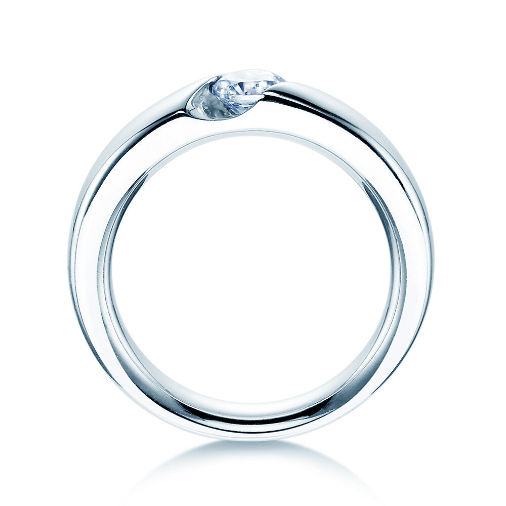 Ein klassischer Spannring, schlicht und elegant. Auf den zweiten Blick offenbart sich seine besondere Raffinesse, die diagonal verlaufende Fassung. Sie gibt dem Diamanten sicheren Halt und sorgt, durch die offen ausgeformten Seiten, für seitlich einfallendes Licht. Der Diamanten beginnt zu strahlen.