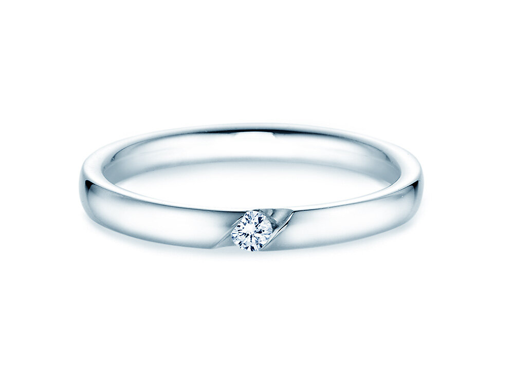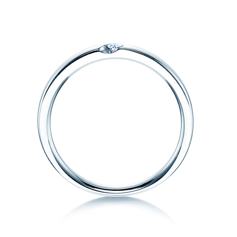 Ein klassischer Spannring, schlicht und elegant. Auf den zweiten Blick offenbart sich seine besondere Raffinesse, die diagonal verlaufende Fassung. Sie gibt dem Diamanten sicheren Halt und sorgt, durch die offen ausgeformten Seiten, für seitlich einfallendes Licht. Der Diamanten beginnt zu strahlen.