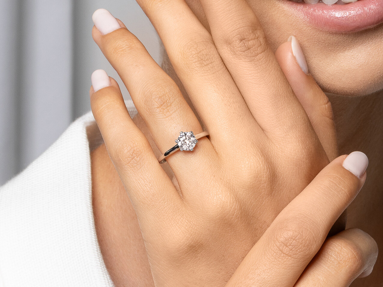 Extrem flach angesetzt und angenehm dezent gestaltet ist die Krappenfassung beim Verlobungsring Madison. Der Diamant bekommt von den Seiten reichlich Licht, um sein hell funkelndes Feuer zu entfachen. Überzeugend ist das sachlich moderne Design der Ringschiene mit den nach innen abfallenden Flanken. Dieser Kniff gibt dem Ring zusätzliche Leichtigkeit am Ringfinger – ein echter Pluspunkt bei grazilen Händen.