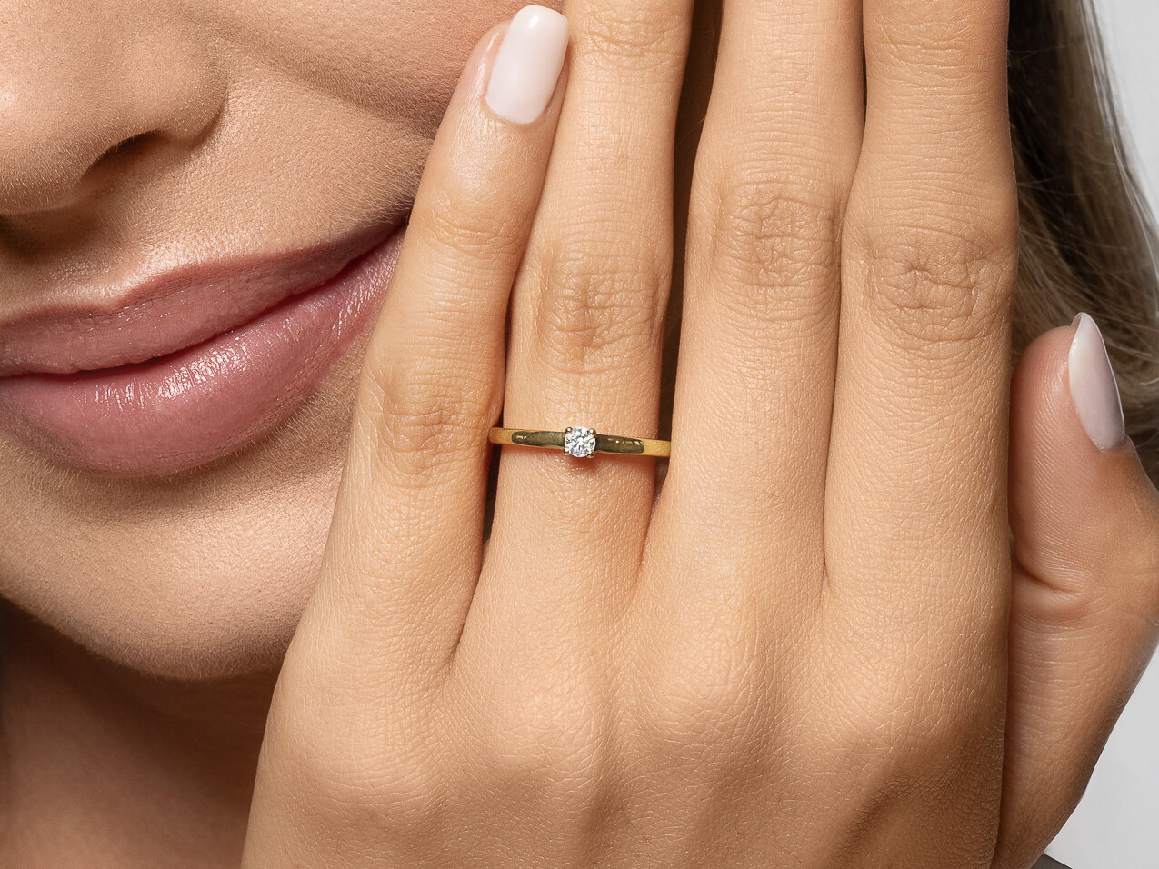 Verlobungsring Modern Petite mit echtem Diamant und vierer Krappenfassung. Durch die dezente Fassung des Solitärring Modern Petite kann sich das Licht im Diamanten exzellent brechen.