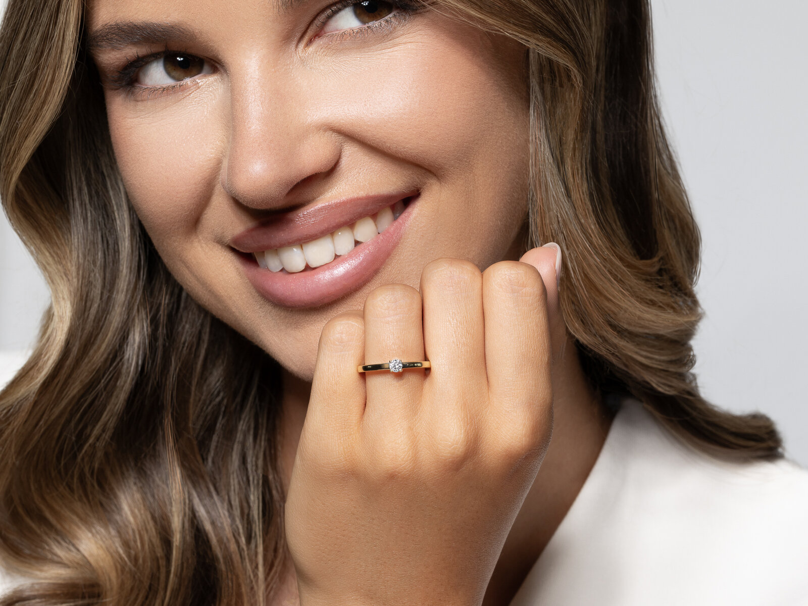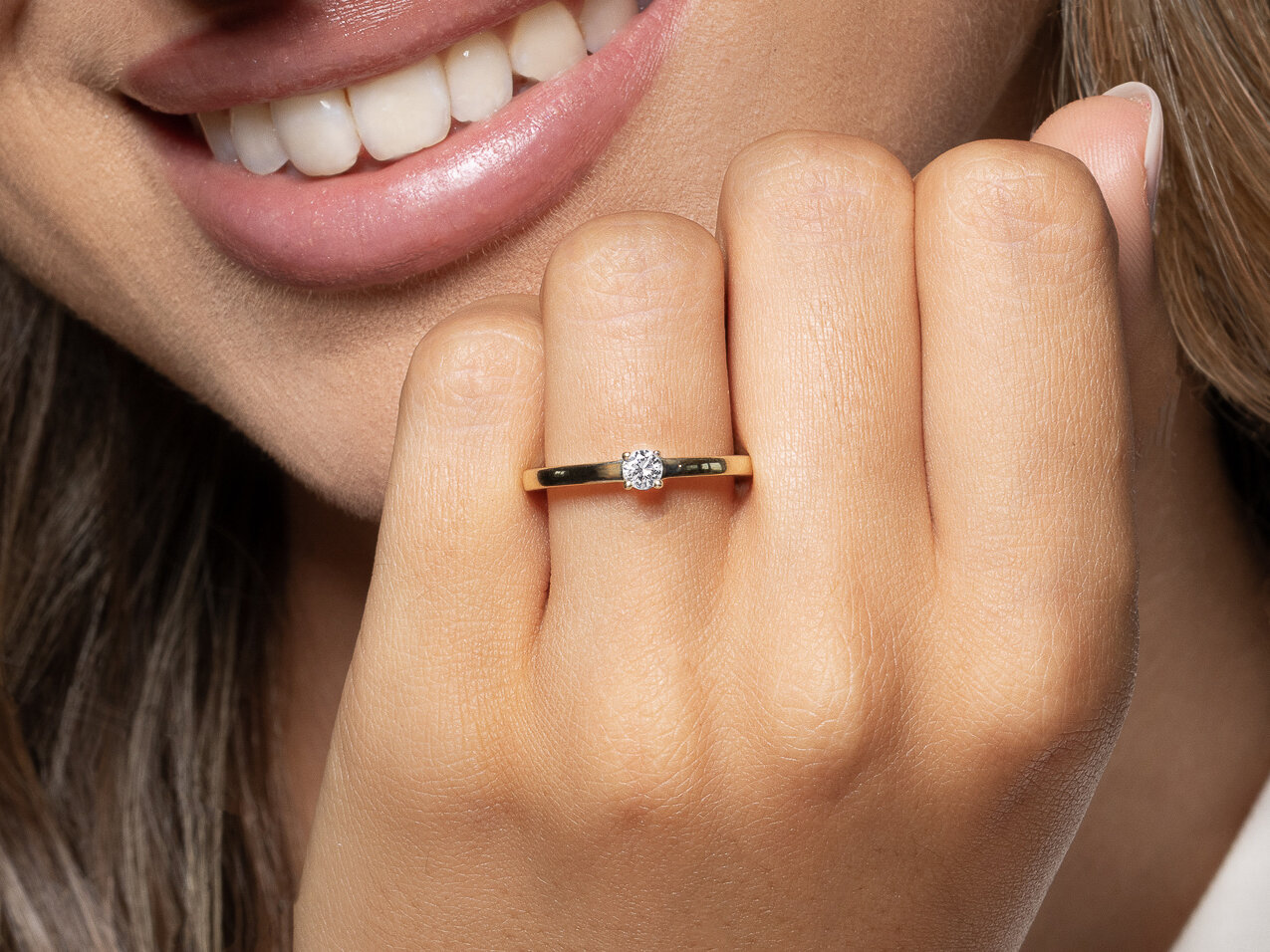 Verlobungsring Modern Petite mit echtem Diamant und vierer Krappenfassung. Durch die dezente Fassung des Solitärring Modern Petite kann sich das Licht im Diamanten exzellent brechen.