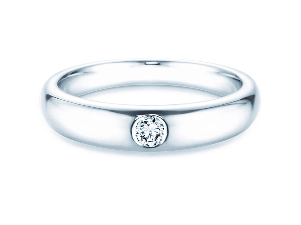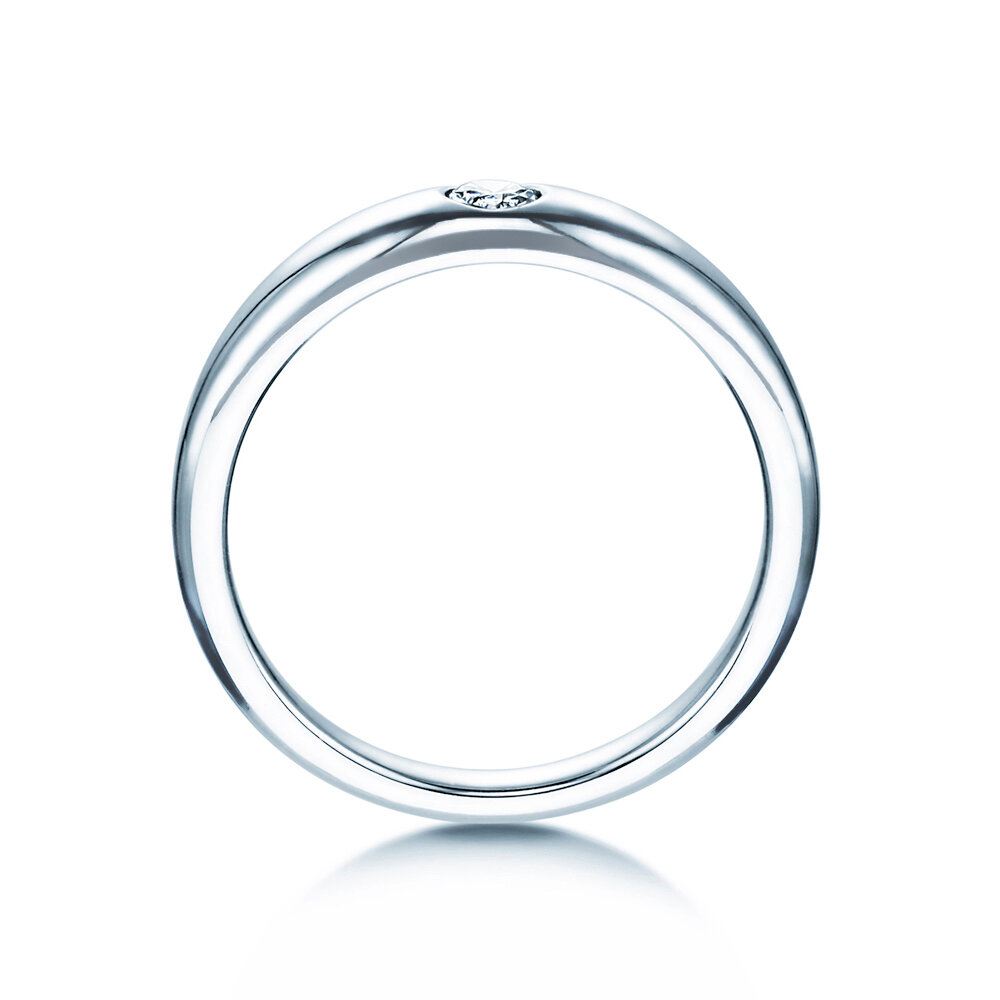 Die Ringform ist schlicht und klassisch – vielleicht könnte man sie als die klassische Ringform schlechthin bezeichnen. Die abgerundete Außenseite wird betont durch einen dezent in die Ringschiene eingearbeiteten Diamanten, der das Modell Promise zu einem echten Highlight macht. Der leuchtend helle Diamant wird geschützt durch die Ringschiene.